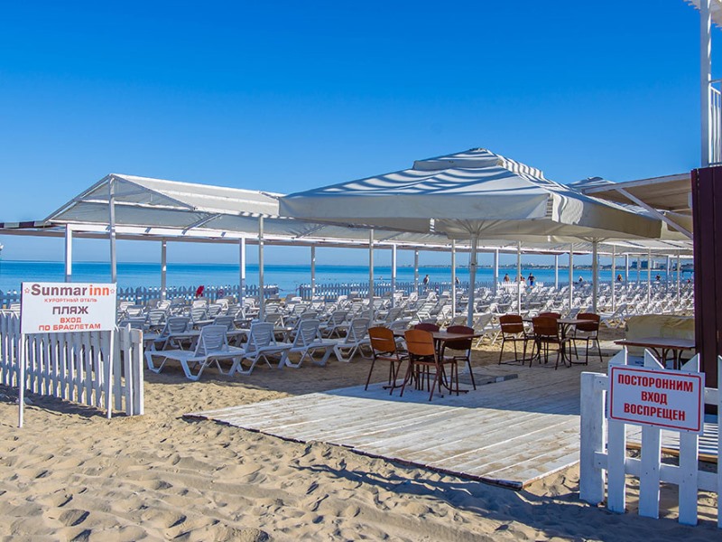 Собственная пляжная зона, огороженная забором, вход на территорию которой строго по картам гостя, оборудованная шезлонгами и теневыми навесами, волейбольной площадкой, спасательным и медицинским пунктами, туалетом, душевыми и кабинками для переодевания.