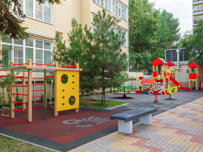 Детская игровая площадка с резиновым покрытием, горками, каруселями, канатами и рукоходами.